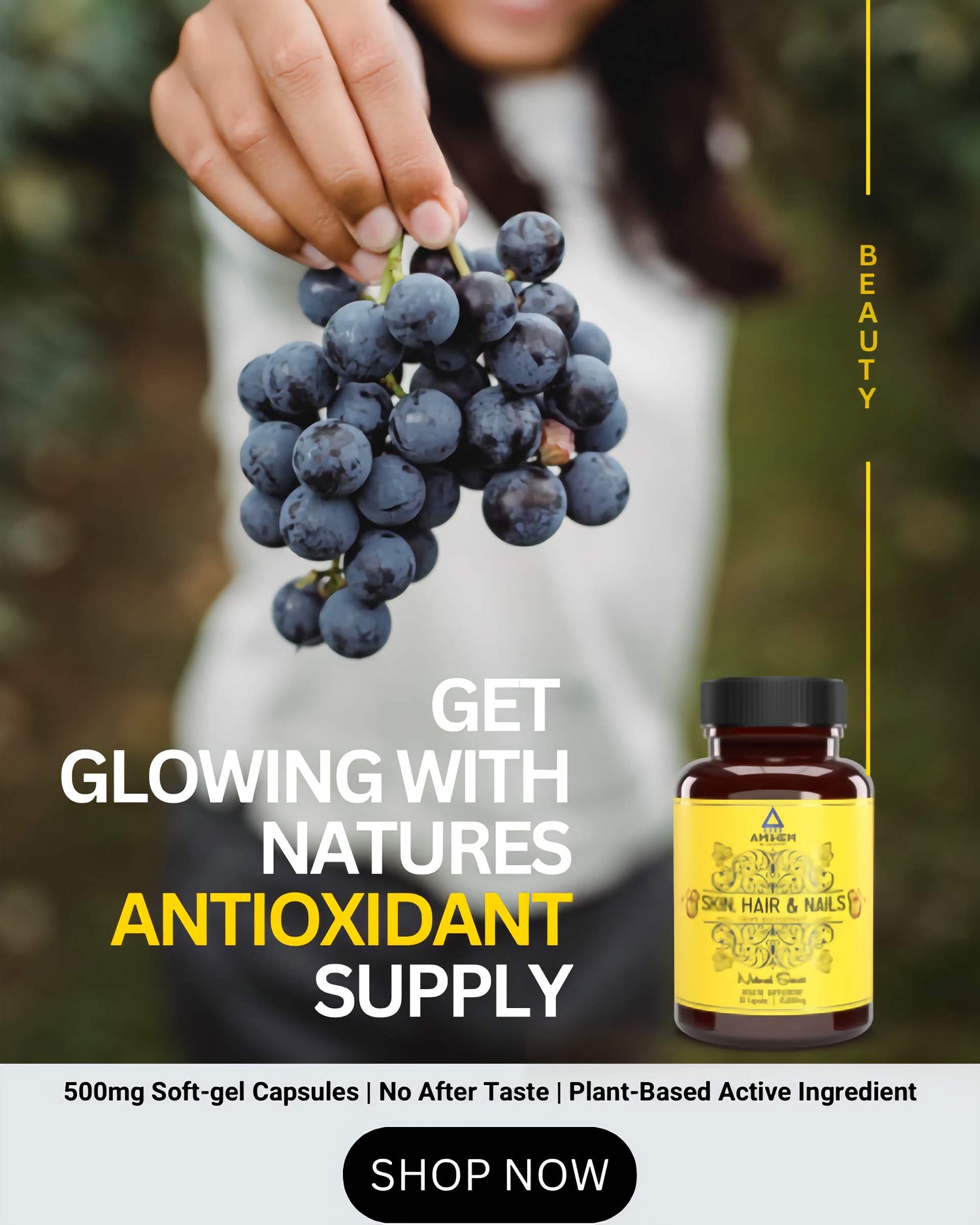 AMIHEM's Grape Seed Extract offers a potent concentration of 99% polyphenols, powerful water-soluble compounds renowned for scavenging free radicals. Backed by scientific research, polyphenols combat premature aging, cellular damage, and support healthy skin production, aiding hyperpigmentation and repairing sun damage. Additionally, they promote cardiovascular health and balance the immune system. Each capsule contains a maximum strength of 500mg of premium pure extract, ensuring optimal efficacy without any aftertaste.